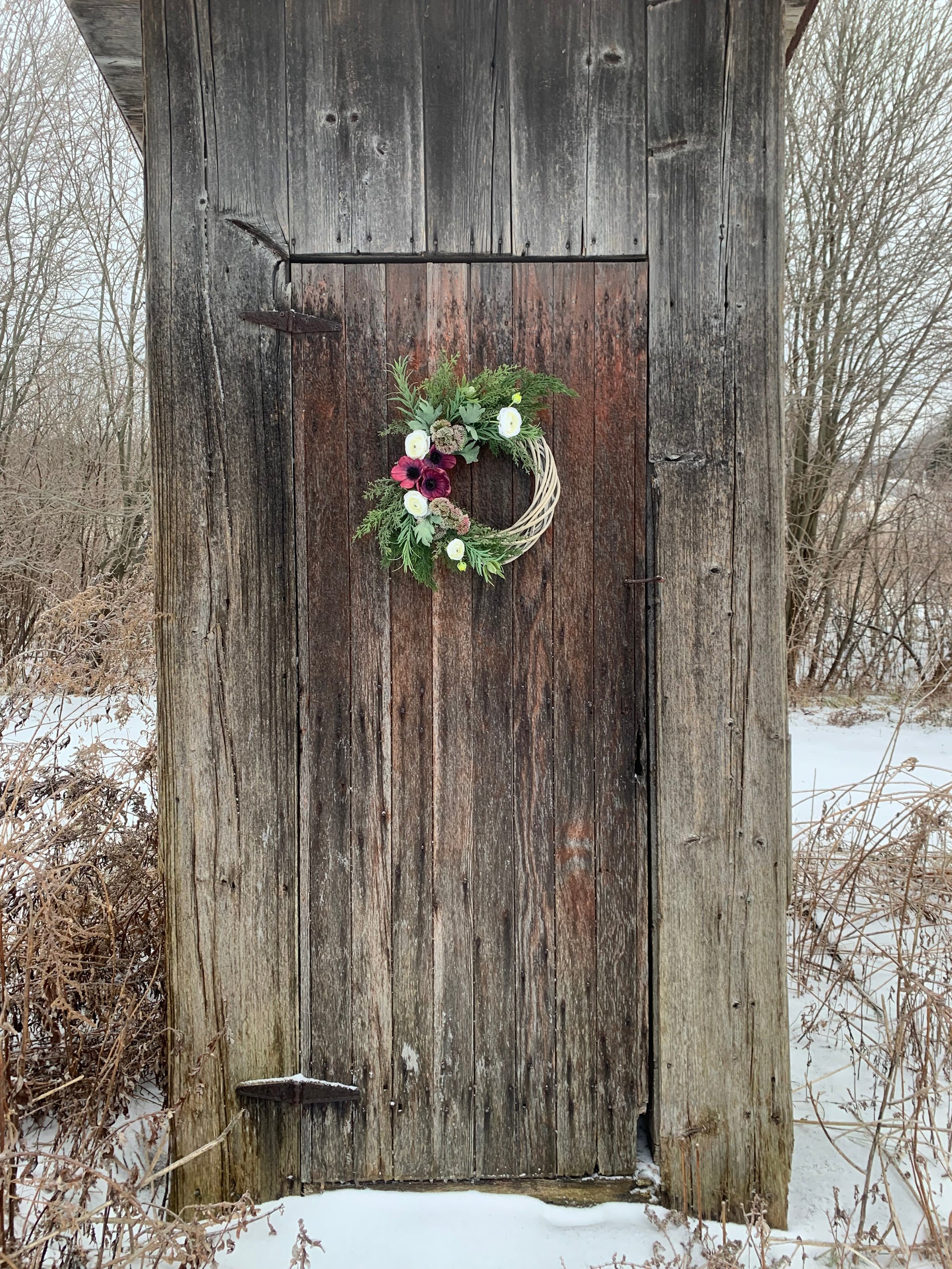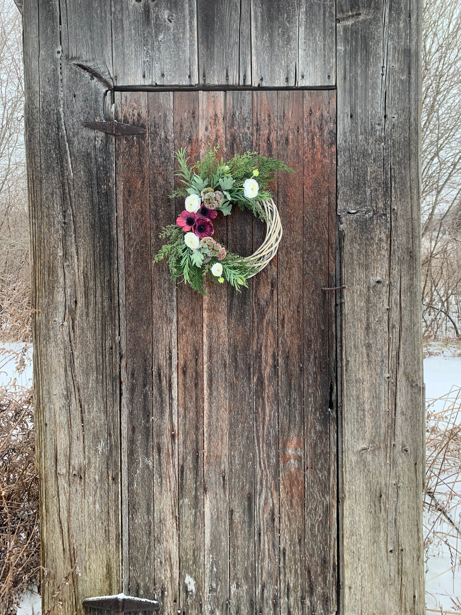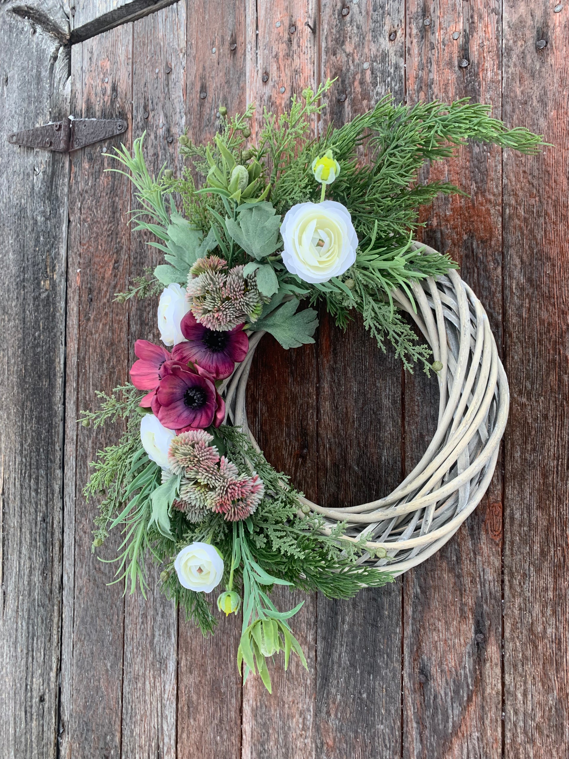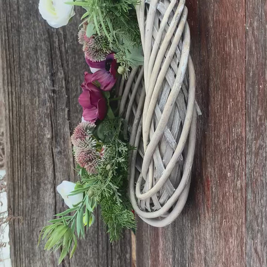 This Anemone and Ranunculus spring wreath is expertly crafted on a willow base and features beautiful faux florals. With its vibrant colors and intricate design, it is the perfect addition to any home decor. Enjoy the beauty of spring all year round with this stunning wreath.