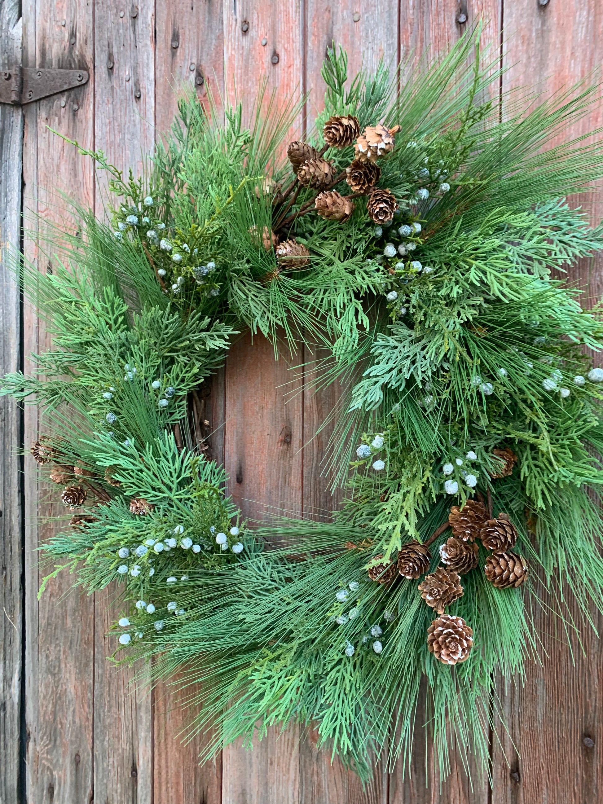 This faux cedar pine and juniper berry wreath brings a touch of natural beauty to any space. Made with realistic-looking materials, this wreath will add a charming and rustic touch to your home. Enjoy the look of freshly picked winter greenery all season long.