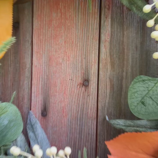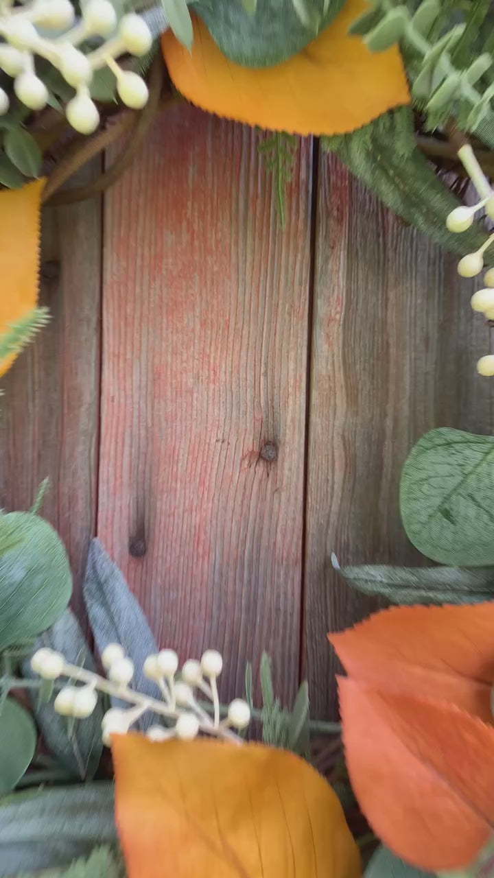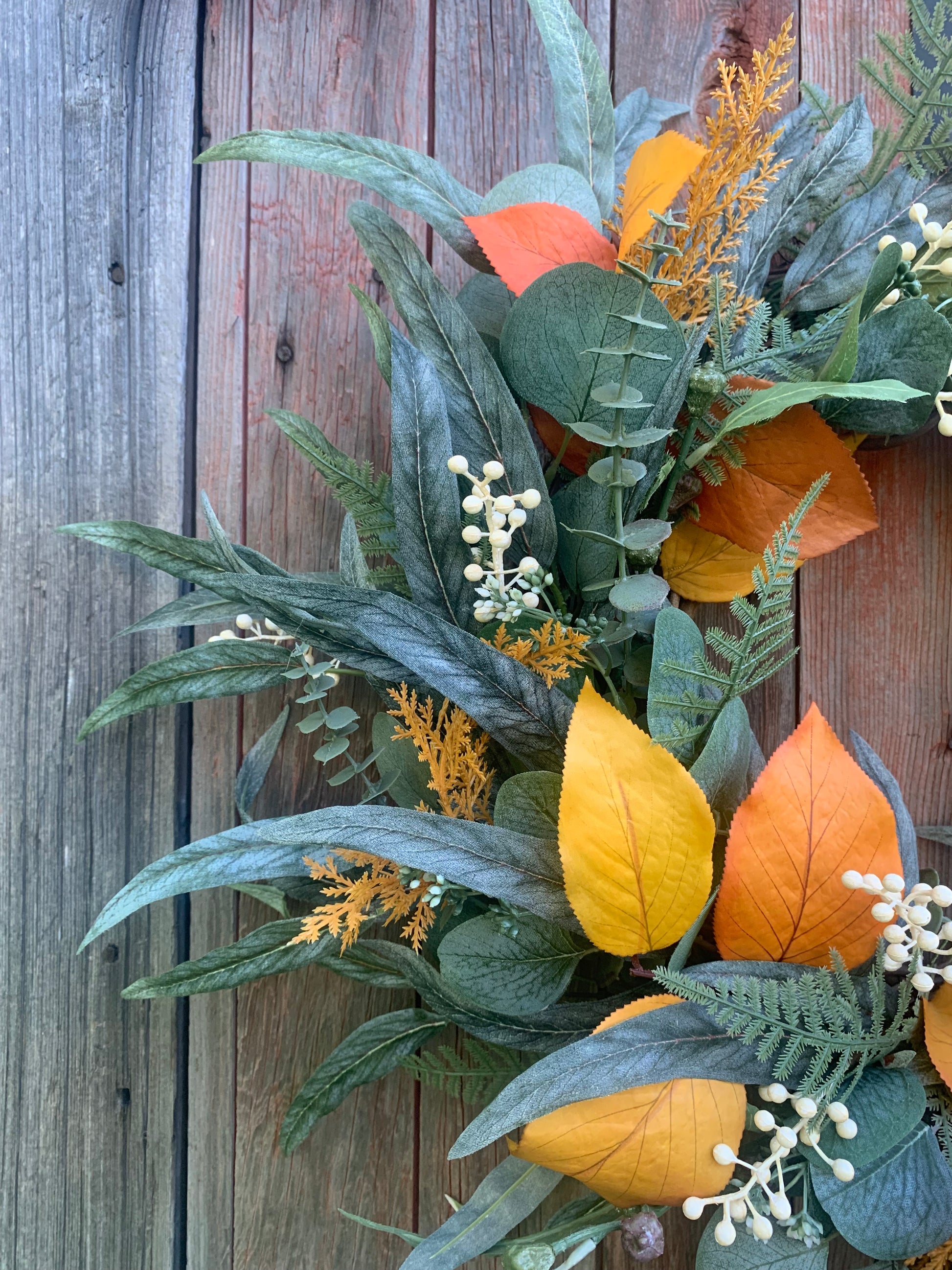 This faux fall eucalyptus wreath is a beautiful addition to any front door decor. Featuring realistic fall foliage and delicate white berries, it adds a touch of elegance and warmth to your home. The perfect way to greet your guests this season.