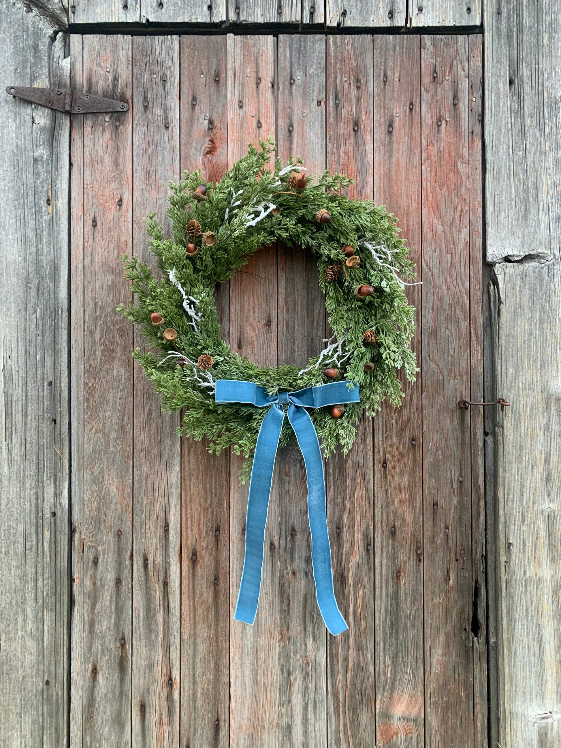 This faux iced cedar and acorn winter wreath features shimmering cedar, mini acorns, snowy branches, and a Robbin's egg blue velvet bow. Adorn your home with a touch of winter wonder with this elegant and lifelike wreath. The perfect statement piece for your front door this season.