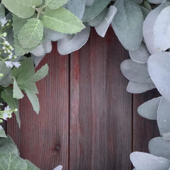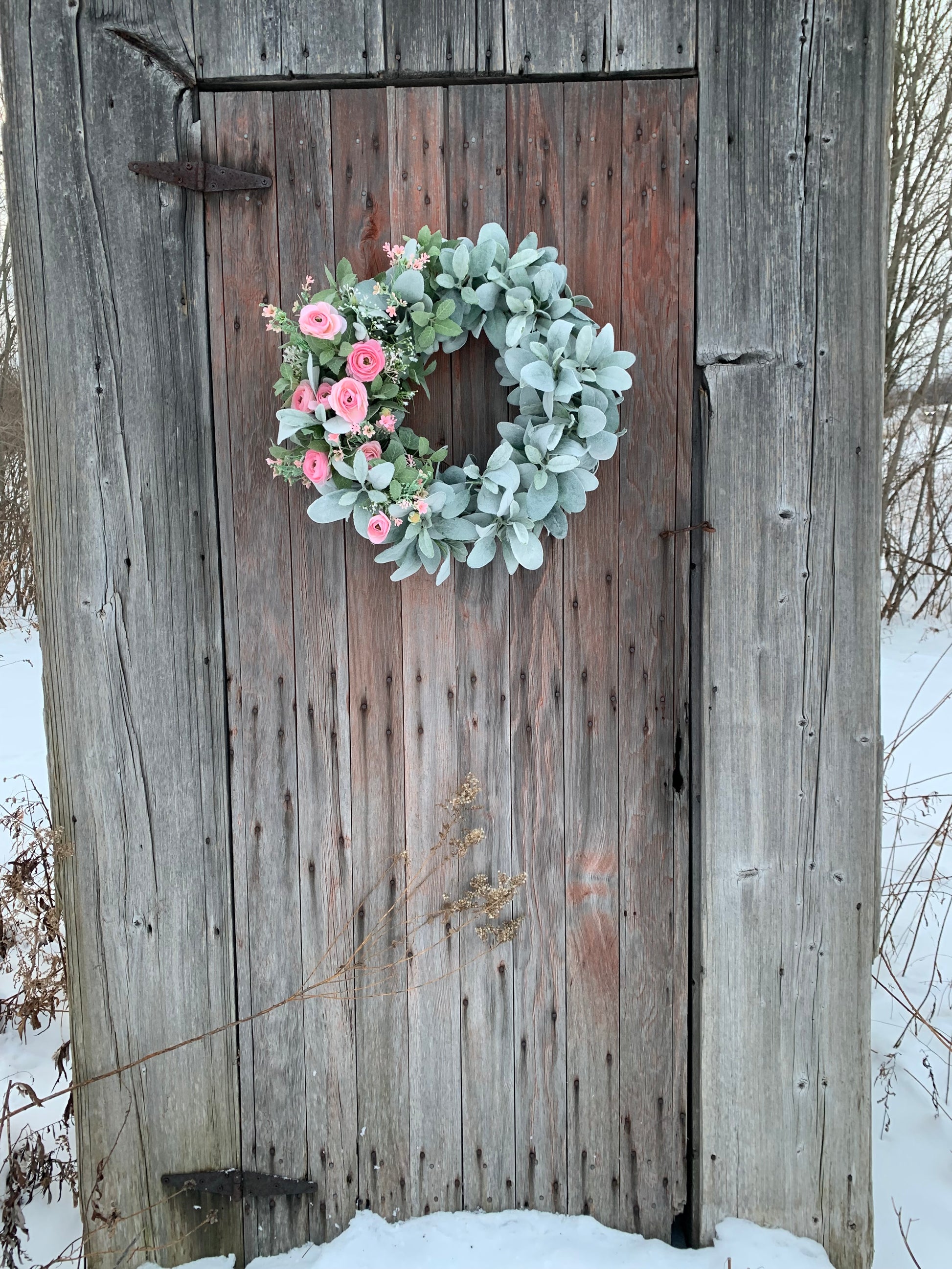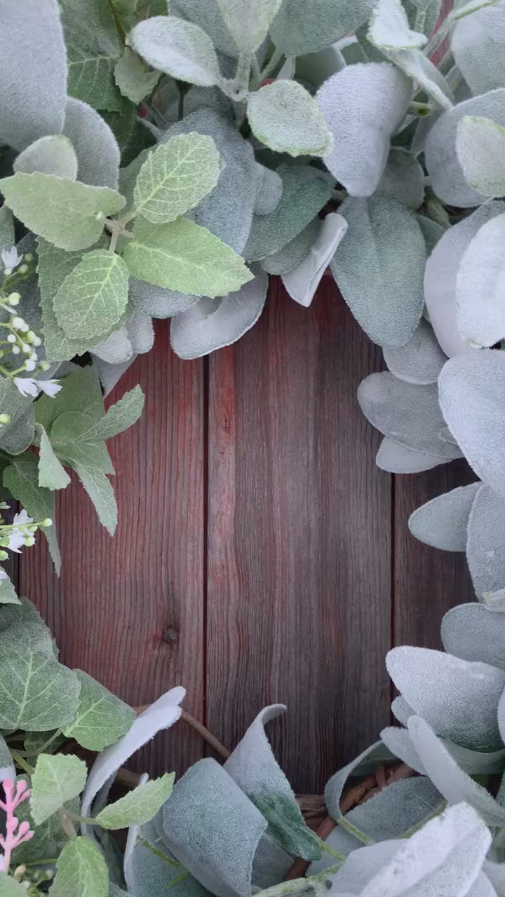 Designed with delicate pink ranunculus blooms and silvery lamb’s ear greenery, this wreath offers a timeless, welcoming look.