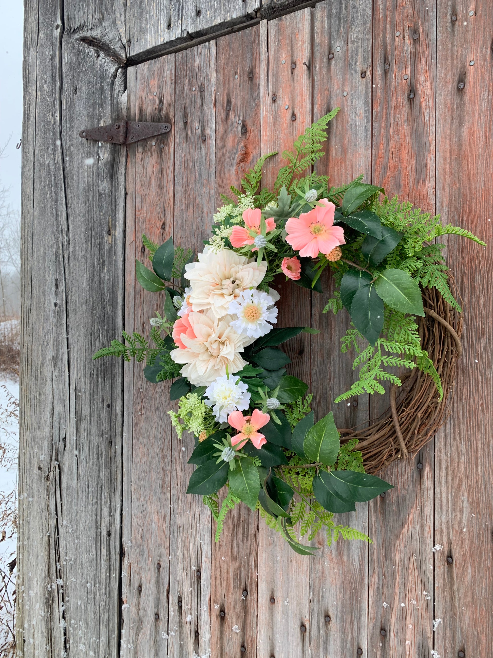 Welcome spring with delicate dahlias, airy cosmos, and Scabiosa arranged in lush greenery on a rustic grapevine base. A beautiful accent for early spring. Perfect for a front door, entryway, or porch, this wreath brings a touch of springtime beauty to your home and transitions effortlessly from spring to summer.